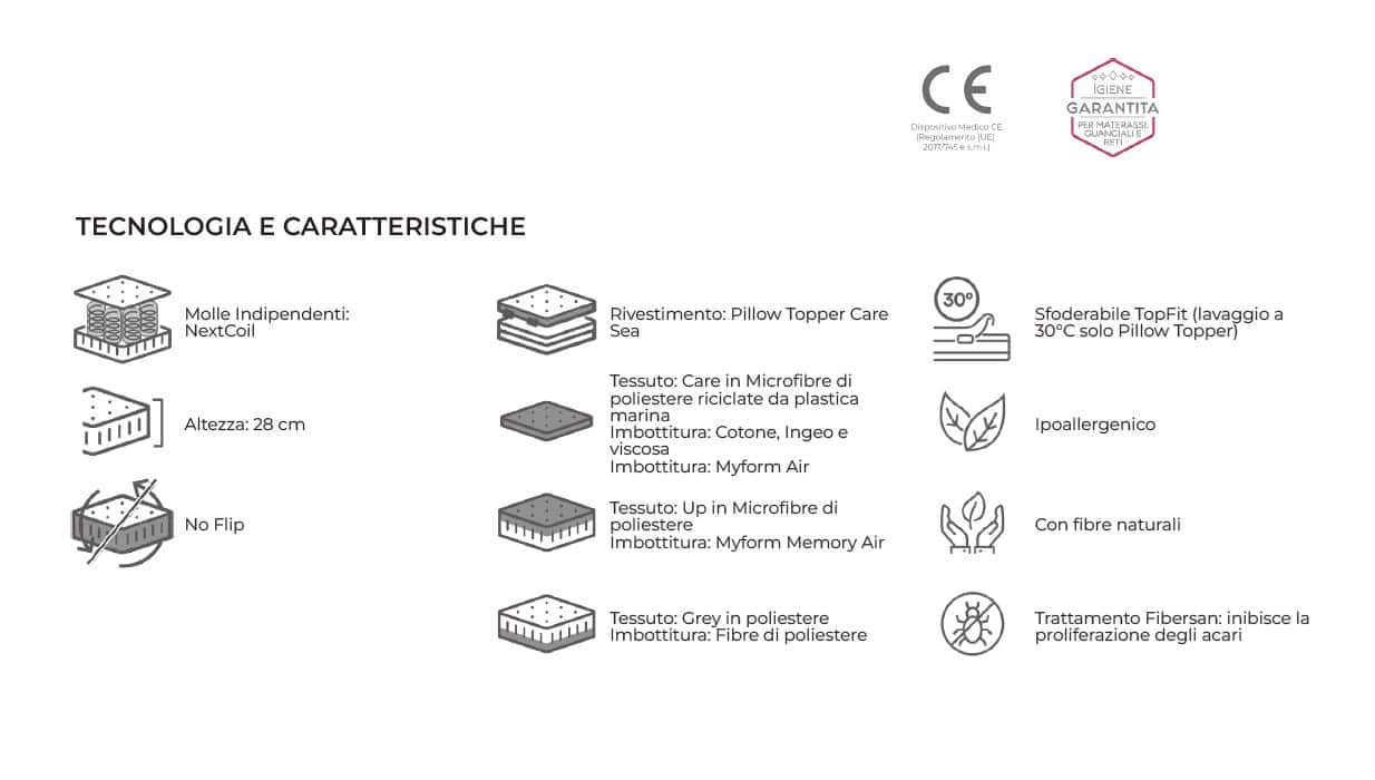 Allura racchiude una struttura a molle indipendenti NextCoil con 7 zone differenziate e uno strato interno in Myform Memory Air che lavora in sinergia con il Pillow Topper, per offrire un supporto calibrato e accoglienza più mirata. Il Pillow Topper sfoderabile combina Cotone, Ingeo e Myform Air, valorizzando il tessuto sostenibile riciclato da plastica marina e la pregiata estetica capitonné. Fibersan, a base di oli essenziali naturali, assicura protezione costante da acari e allergeni. Una soluzione equilibrata, che unisce comfort naturale, supporto calibrato e una sensazione di accoglienza autentica.