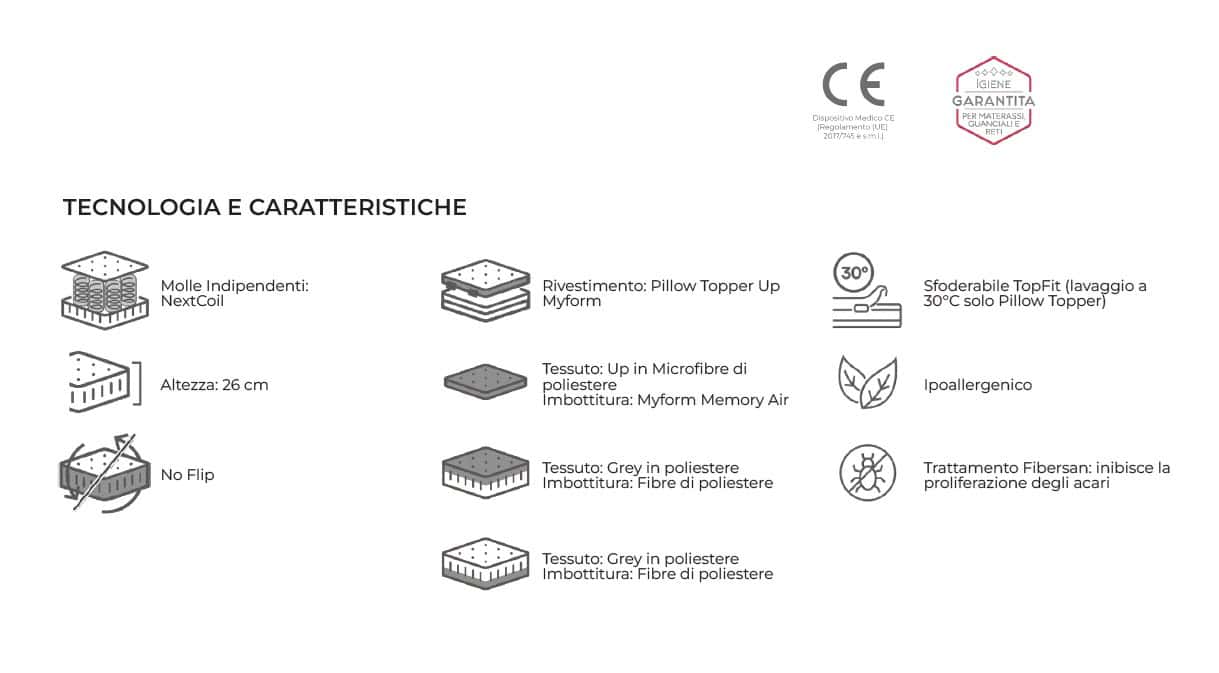 Aura unisce molle NextCoil indipendenti a un Pillow Topper sfoderabile con Myform Memory Air, che si adatta ai profili del corpo e riduce i punti di pressione. La struttura lavora in modo differenziato su ogni zona, offrendo sostegno e comfort calibrati. Grazie alla sua struttura a celle aperte, il Myform Memory Air all’interno del topper mantiene il piano di riposo più asciutto. Fibersan garantisce una protezione attiva dagli acari. Una soluzione confortevole e pratica, pensata per chi vuole un materasso funzionale con un tocco di accoglienza in più.
