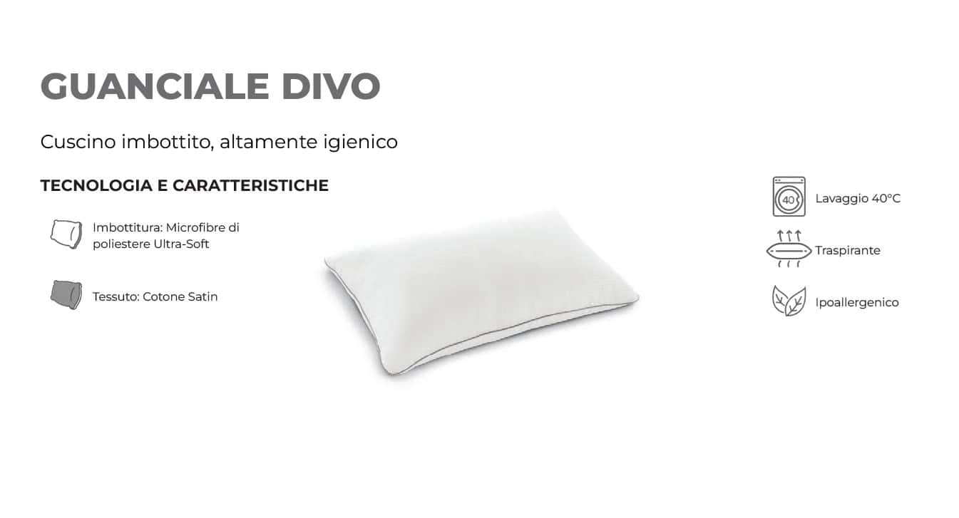 Il guanciale è composto da una imbottitura in microfibre di poliestere elastiche e resistenti, avvolte da un pregiato rivestimento in raso di cotone dotato di un elegante piping perimetrale grigio perla. Igienico e piacevole al tatto, Divo sa sostenere il capo con leggerezza e senza pressioni.