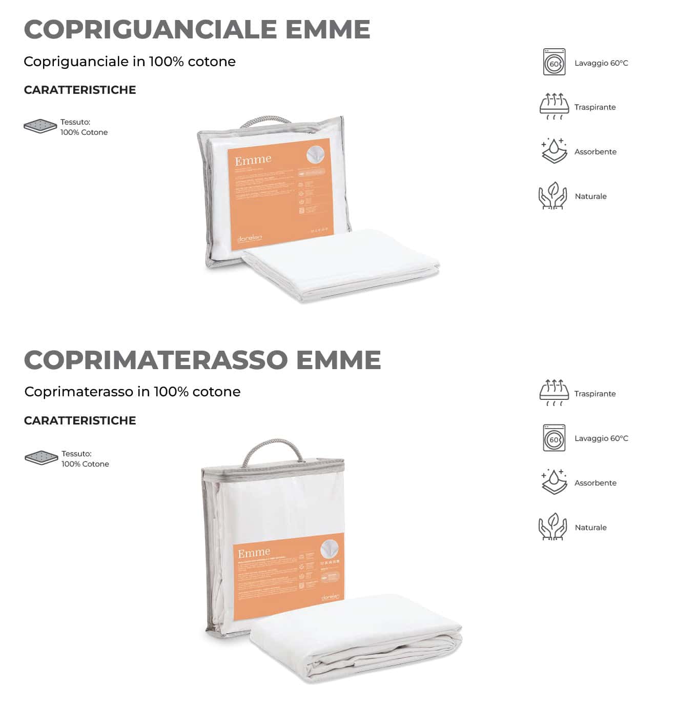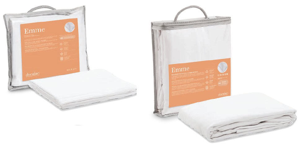 Il coprimaterasso e il copriguanciale Emme sono realizzati in 100% cotone sanforizzato che li rende freschi, traspiranti ed estremamente resistenti ai lavaggi.