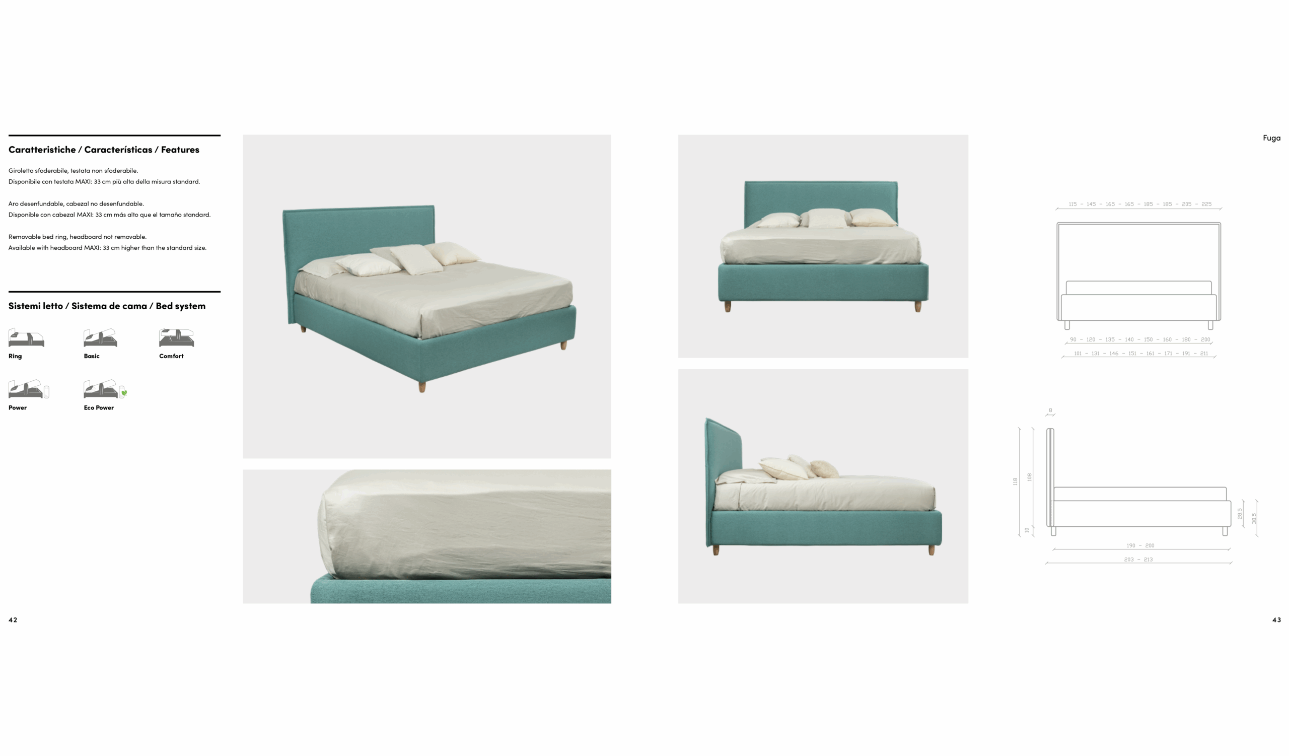 Un letto che si distingue per le sue linee rette, che gli conferiscono un aspetto moderno e ordinato. La testata, con un’elegante flangia che corre lungo il suo perimetro, aggiunge un tocco di raffinatezza e di dettaglio senza perdere la semplicità. Il suo stile pulito e strutturato si adatta a qualsiasi ambiente, offrendo un design semplice che non passa mai di moda.