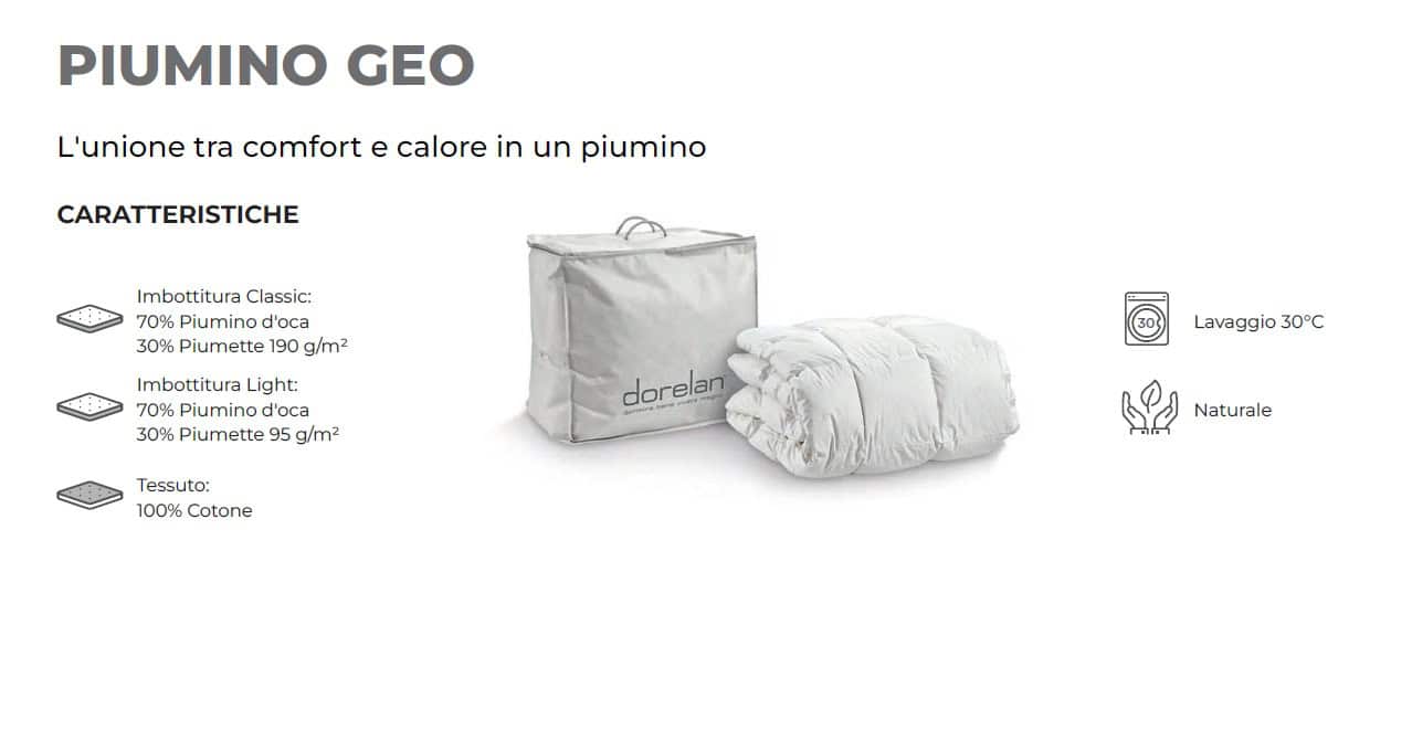 La morbida imbottitura del piumino Geo è composta al 70% da piumino e al 30% da piumette per offrire una gradevole sensazione di accoglienza e mantenere costante la temperatura durante il riposo.