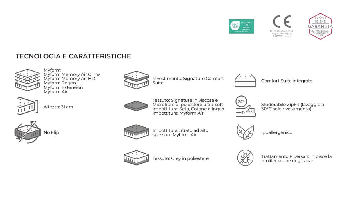 Il raffinato Comfort Suite accoglie con un’armonia che si percepisce al primo contatto. Il rivestimento in Viscosa e Microfibre ultra soft e le imbottiture in Seta, Cotone e Ingeo donano una piacevole freschezza naturale.