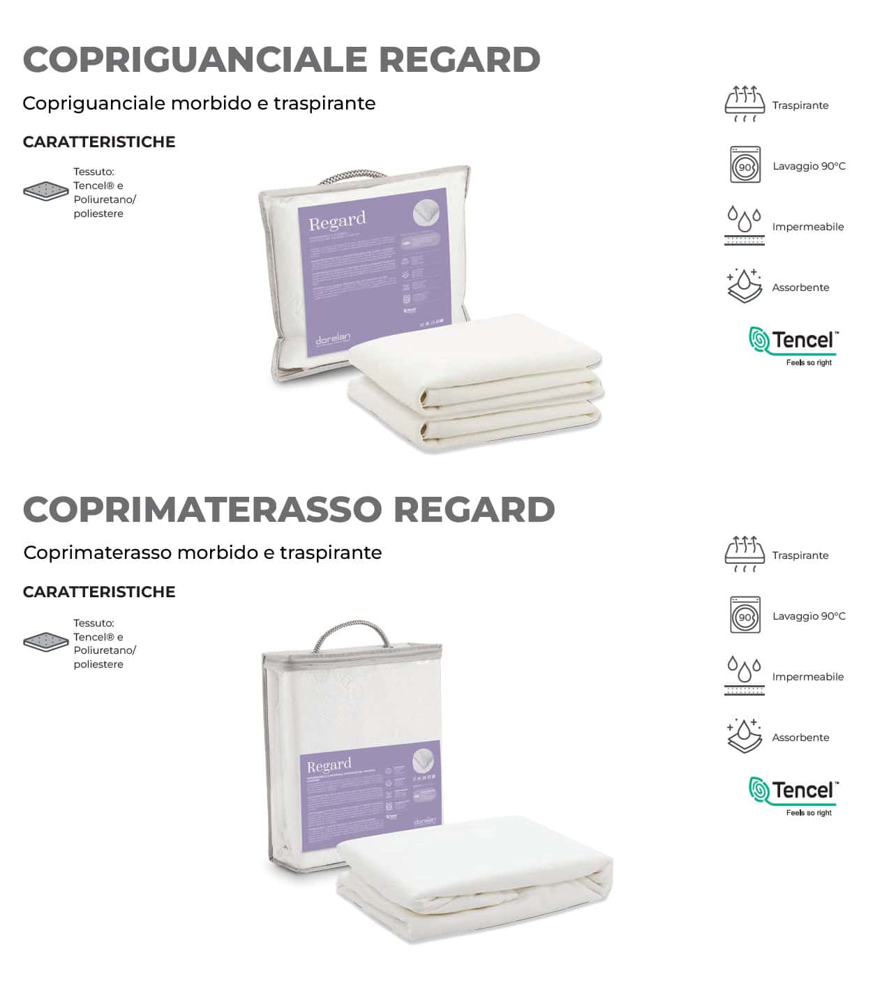 Il coprimaterasso e il copriguanciale Regard sono studiati per proteggere al massimo il materasso e il guanciale. Il morbido tessuto in Tencel viene reso impermeabile con un particolare processo che ne preserva la morbidezza e traspirabilità a tutto vantaggio del comfort di riposo.