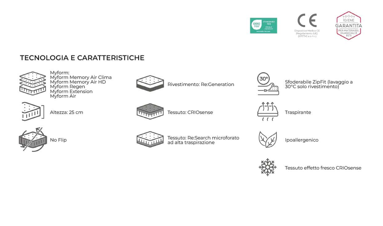 Il vero benessere nasce dal sonno. ReGeneration è il materasso evoluto progettato per rigenerare corpo e mente attraverso un’esperienza di comfort superiore e di qualità del riposo senza compromessi. Ogni componente è studiato per ristabilire l’equilibrio psicofisico, favorendo notti profonde, continue, rigeneranti. La combinazione di Myform Memory Air Clima, Myform Memory Air HD e Myform Regen crea un comfort adattivo multistrato che si calibra istantaneamente sulla morfologia del corpo, riducendo microtensioni e favorendo un rilassamento neuromuscolare profondo. Il risultato è un sonno più continuo, con meno risvegli notturni, e una qualità del riposo che si percepisce a ogni risveglio. Myform Extension e Myform Air aggiungono elasticità dinamica e ventilazione attiva, garantendo un supporto preciso e leggero a ogni movimento notturno. Il rivestimento in tessuto CRIOsense, con struttura tridimensionale e tecnologia termica attiva, amplifica la freschezza percepita e mantiene un microclima ideale, contribuendo a una sensazione di comfort prolungato, indipendentemente dalle condizioni esterne. Perché un sonno più profondo e continuo si traduce, ogni giorno, in maggiore energia, lucidità mentale e benessere generale. ReGeneration è molto più di un materasso: è un sistema avanzato di rigenerazione personale, per chi considera il sonno il fondamento della propria salute e qualità di vita.