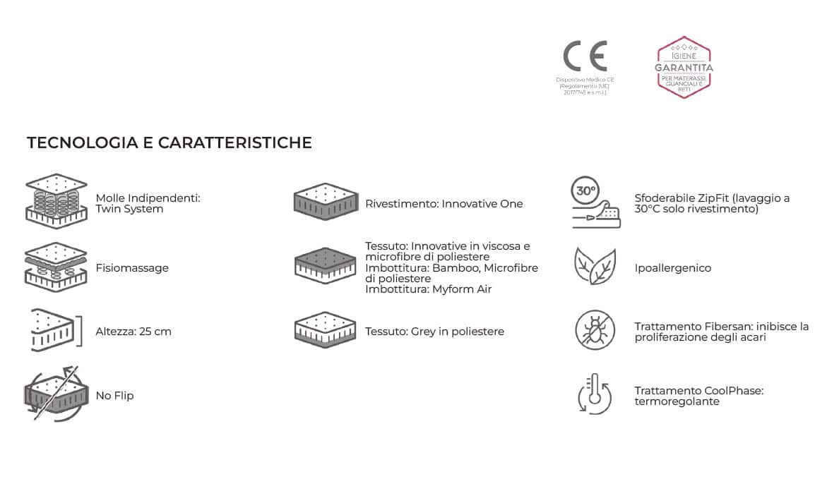 Estetica moderna e tecnologie evolute rendono Rising un materasso pensato per un comfort preciso e reattivo. Il rivestimento in viscosa e la fascia in velluto grigio-tech valorizzano l’eleganza, mentre l’imbottitura in bamboo sostiene un microclima fresco e sano. Fibersan contribuisce a mantenere il materasso sempre igienicamente protetto, notte dopo notte. CoolPhase assicura una regolazione termica ottimale. Il molleggio Twin System, con spirale doppia, garantisce un sostegno calibrato e una risposta immediata ai cambiamenti posturali, mentre FisioMassage accompagna il corpo con un supporto fluido. Rising, l’energia del comfort Twin System al servizio del tuo riposo.