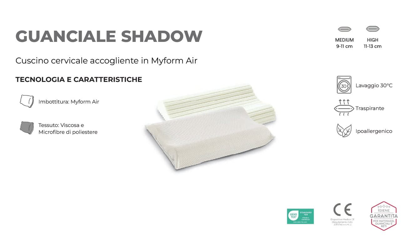 La speciale sagomatura ortocervicale permette di scegliere fra due diversi spessori di appoggio delle spalle e del collo. La versione HIGH ha 11 e 13 cm di spessore, mentre la versione MEDIUM ha 9 e 11 cm.