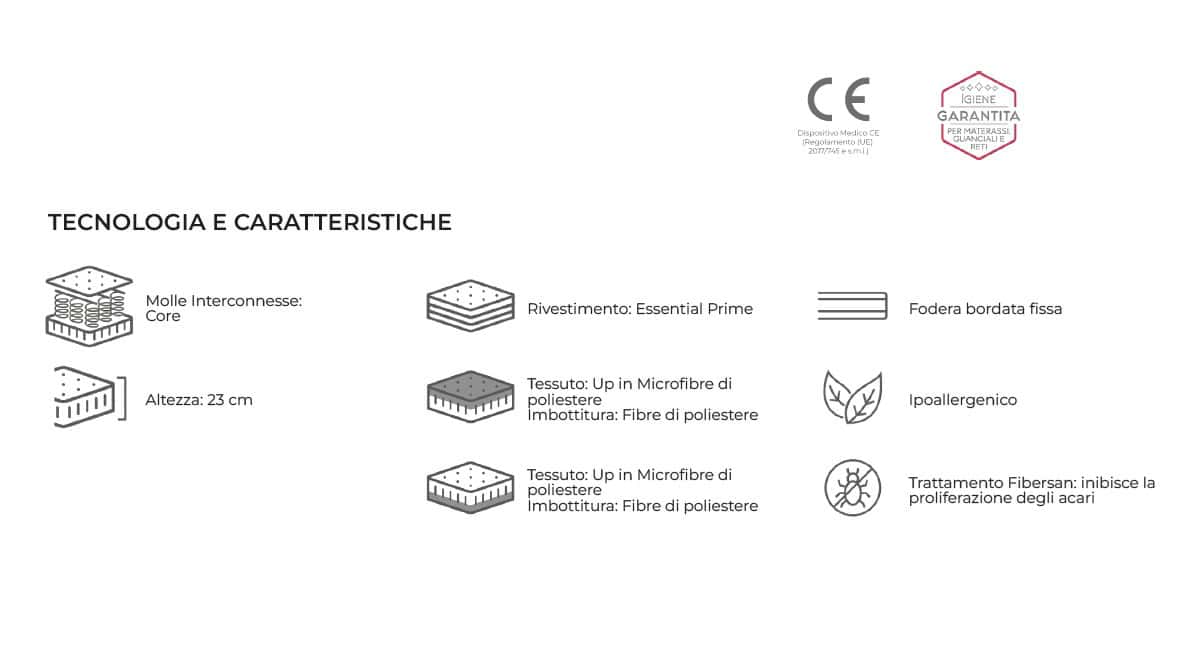 Solido, affidabile, essenziale. Il materasso con tecnologia a molle Core offre un sostegno robusto e continuo, ideale per chi privilegia la semplicità d’uso. La fodera Essential Prime in tessuto stretch con imbottitura in fibre di poliestere e trattamento Fibersan antiacaro garantisce igiene e praticità. La scelta ideale per un comfort affidabile e funzionale nel tempo.